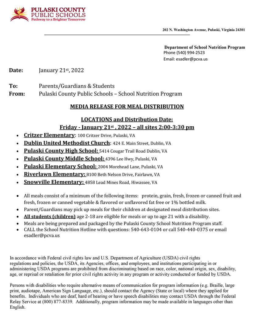 Pulaski County Public Schools will be offering meal distribution from 2:00 -3:30 p.m. for all children, ages 2-18, on Friday, January 21, 2022 at the following locations: